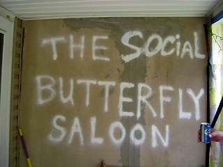 Now, I have a back porch and a small yard. When I first got here it had one tree, one telephone pole, a brick patio, and four rose bushes. I have since added a bar (which I made from 63 empty kitty litter buckets and three full sized mirrors), a round table, a banquet table, three barstools, a half dozen plastic chairs, a grill, a “4-foot farm,” a reclining beach chair, wind chimes, solar lights, wind socks, artificial flowers, and butterflies, lots of butterflies. I have butterflies made of silk, plastic, and cardboard scattered all over the backyard. I call it Butterfly Alley.
