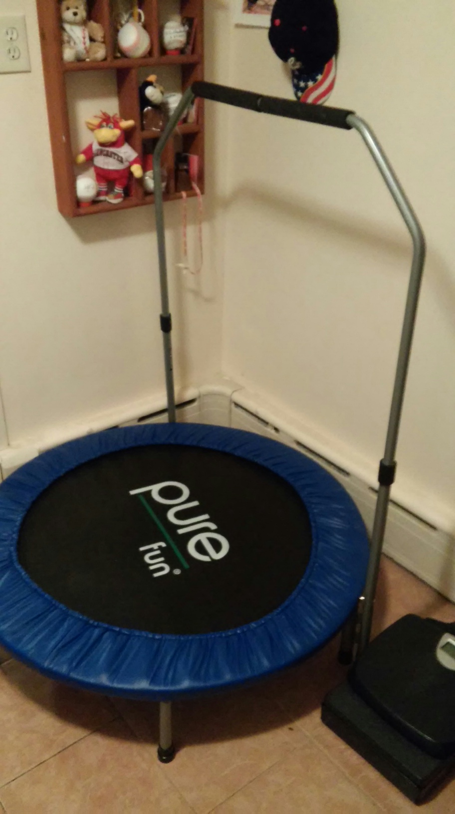 That’s a great idea, I thought, and as soon as I got home, I went online to see what was available that didn’t look too dangerous. I found a mini trampoline that comes with a safety handle bar. I bought it. It was pretty easy to put it together, but I didn’t have the tool to really tighten some of the screws, so I just hand tightened them. Hopefully, I’ll find the wrench I need, before “The Little Tramp” gives me material for another story, one with a moral about a stitch in time saving nine.