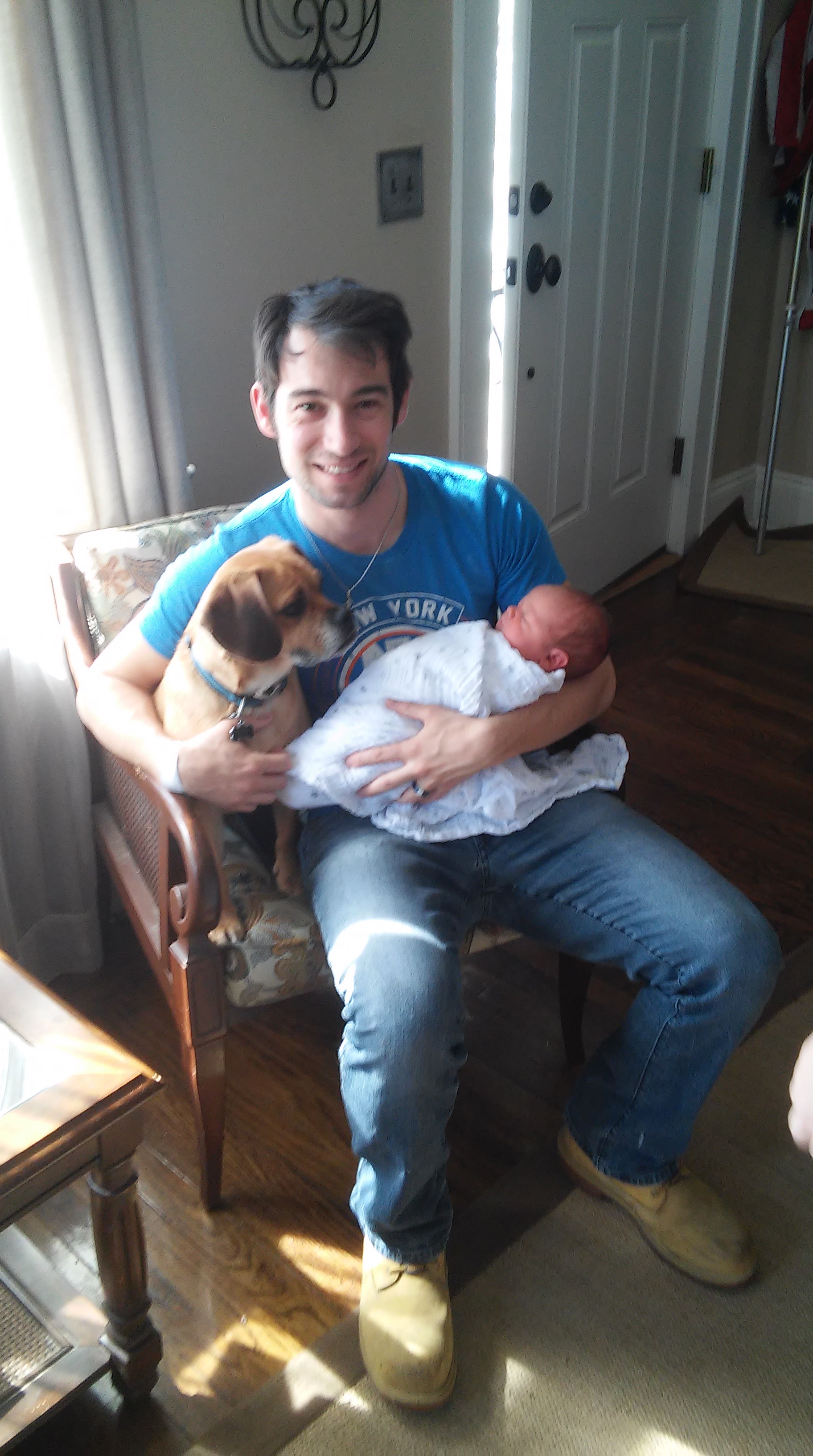 I took this picture of DJ holding the baby and restraining their dog Cujo, I mean Mason, who was probably wondering why there was so much excitement for a tiny creature that couldn’t walk, bark, or feed himself.