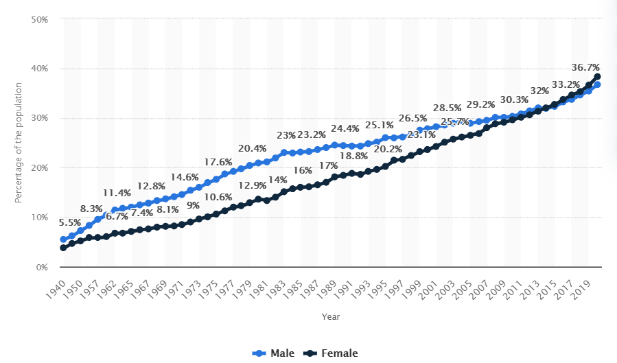 The percentage of people graduating college is going up.
